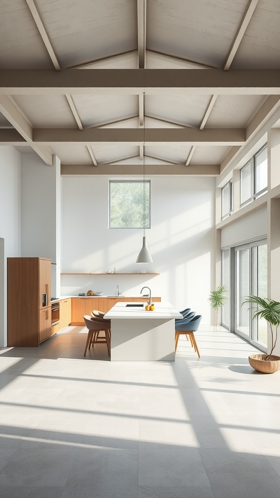 Natural light floods the room through large windows, creating a bright environment that lifts the mood. The greenery from the potted plants adds life to the kitchen, making it not just a cooking area but a space to enjoy and unwind.