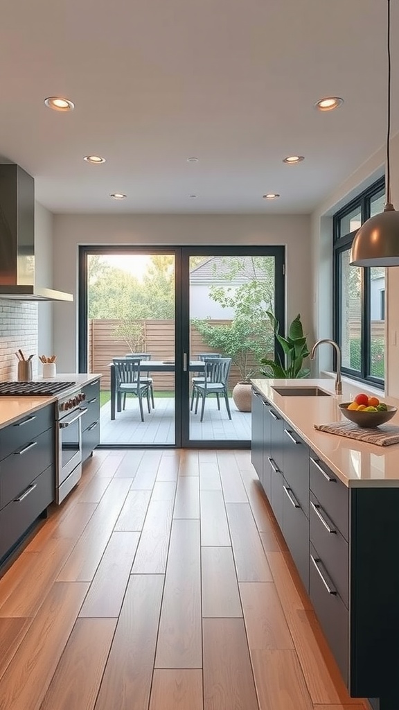 The choice of materials also enhances this flow. The warm wood flooring continues from the kitchen into the outdoor space, creating a harmonious look. This design invites you to gather with family and friends, whether you’re cooking inside or dining al fresco.
