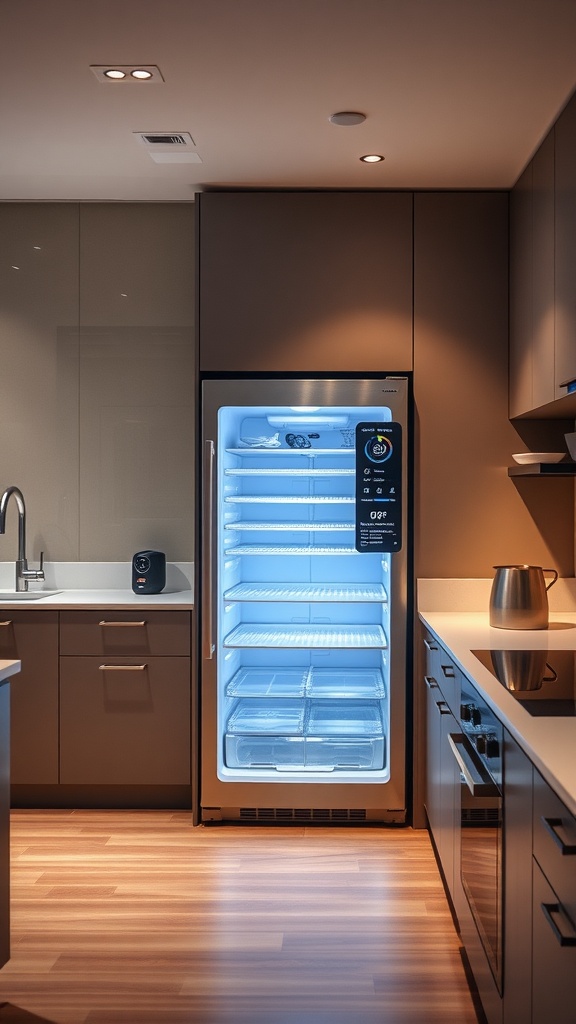 Next to the refrigerator, you can spot cooktops and possibly a smart speaker. These devices can help you with recipes, set timers, and even play music while you cook. With everything integrated, the kitchen feels more connected and organized.