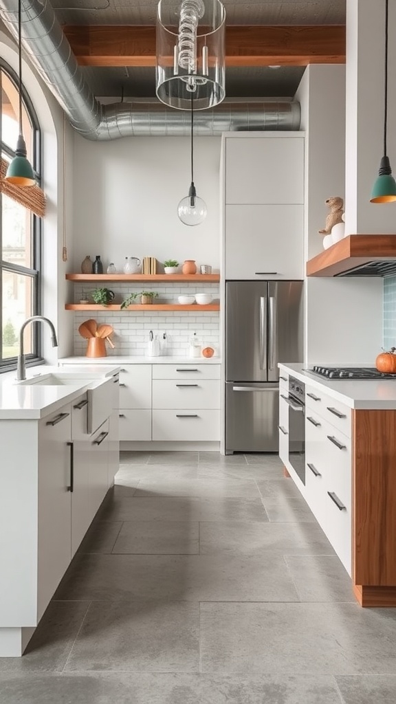 Gray flooring can complement a variety of color schemes, as seen with the crisp white cabinets and warm wood accents in the kitchen. This balance of colors helps create a cozy yet modern atmosphere. Another benefit of this type of flooring is its ability to hide dirt and stains, which is a bonus in busy kitchen spaces.