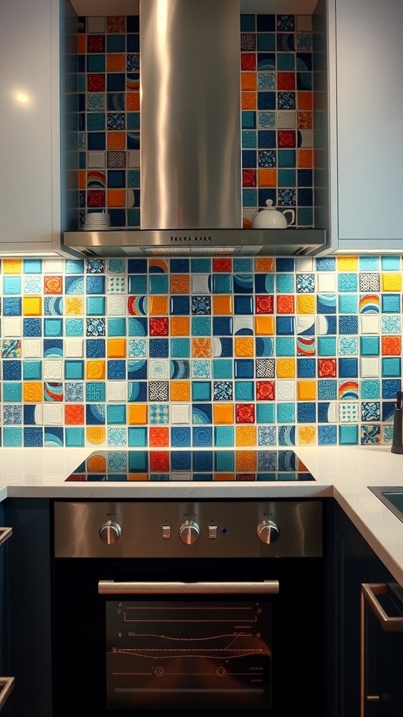 When it comes to modern kitchen design, the backsplash is much more than a functional feature; it’s a canvas for creativity. The image showcases a vibrant and colorful backsplash that draws the eye with its lively patterns and hues. This particular design combines various shades of blue, orange, and red, creating a playful yet cohesive look.