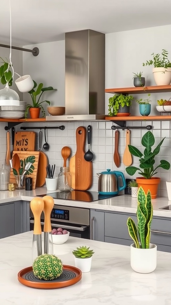 Plants are a popular choice for adding life to the kitchen. In the image, you can spot potted plants on the shelves and counter. They not only bring a splash of color but also help purify the air, making your cooking environment more pleasant.