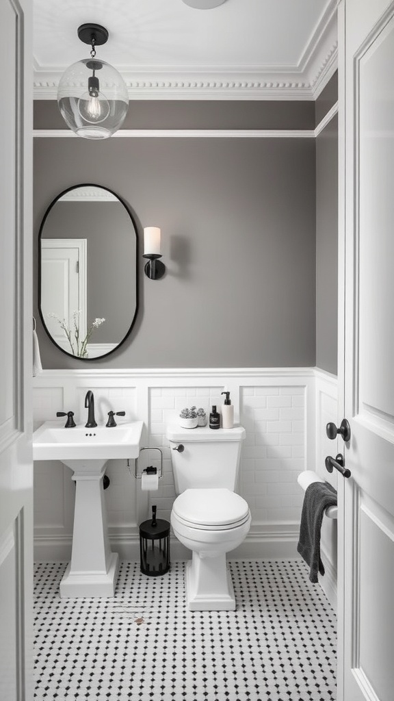 The fixtures, like the sink and toilet, have a timeless design that complements the overall aesthetic. The black and white tile floor adds a playful contrast, grounding the space while enhancing its vintage vibe.