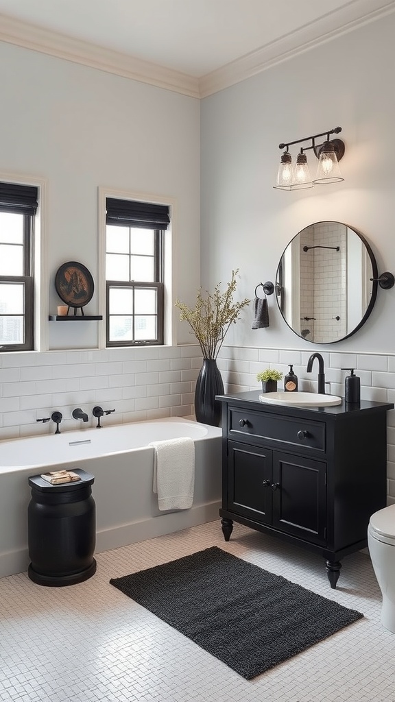 In a neutral bathroom, adding darker elements can create a striking contrast that elevates the overall look. The image showcases a sleek black vanity and accessories against a bright white backdrop. This combination draws the eye and adds depth to the space.