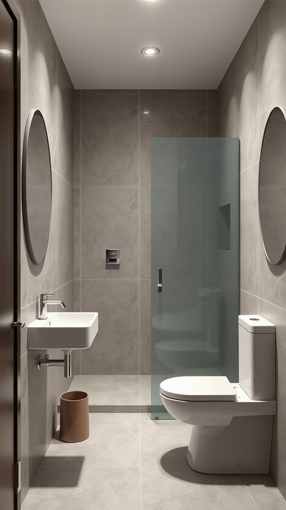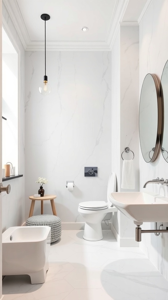 Mirrors with round frames soften the angles in the room, adding a touch of elegance without overwhelming the design. The subtle details, like the simple waste bin, keep the space organized and tidy. Overall, this bathroom exemplifies how modern fixtures can create a serene and inviting environment.
