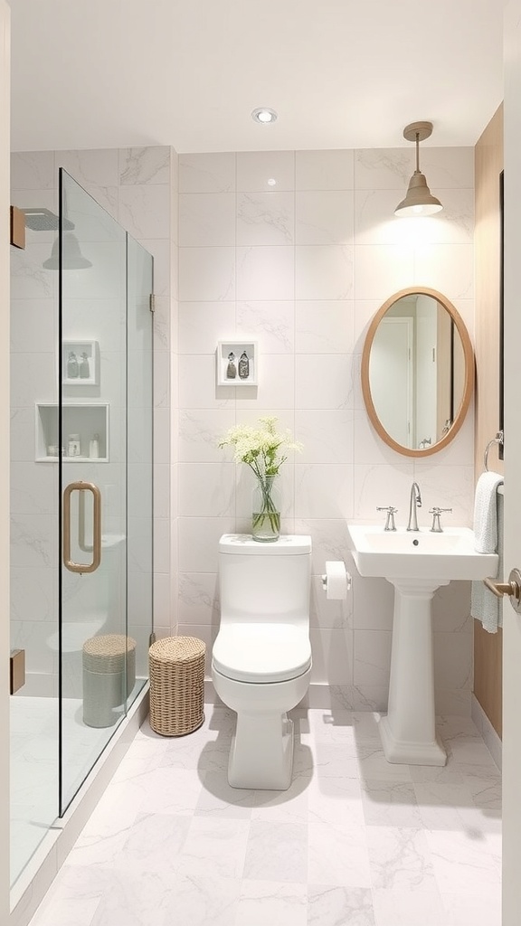 Natural elements, like the small vase with flowers, introduce a refreshing vibe. This combination of muted pastels and natural touches makes the bathroom feel inviting and relaxing. It’s a perfect spot for unwinding after a long day.