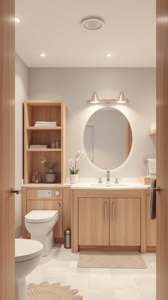 The round mirror above the sink complements the wood nicely, adding a modern touch. This combination of light wood and simple design helps keep the bathroom feeling open and airy. The soft lighting enhances the warm tones, making it a perfect spot to unwind.