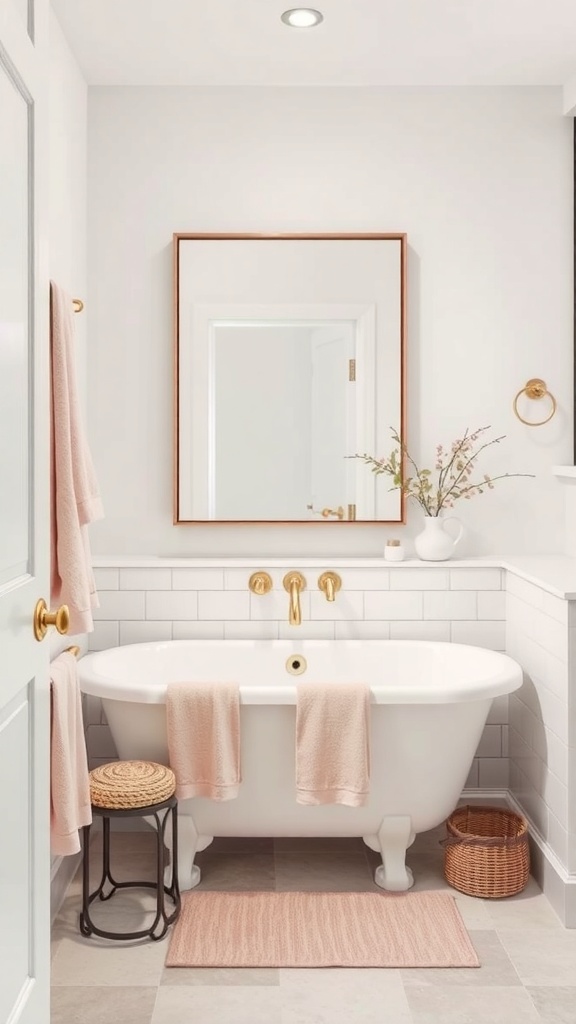 Muted pastel colors can add a cozy feel to any bathroom. In this image, soft pink towels and a matching rug bring warmth to the space. The pastel tones contrast beautifully with the clean white walls and the elegant bathtub.