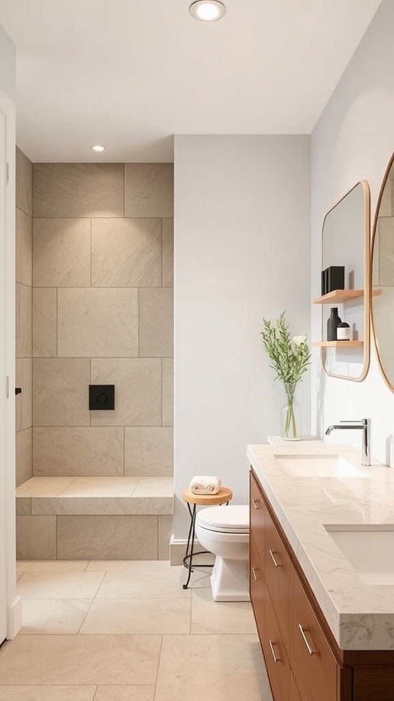 The shower area, with its sleek stone bench, invites relaxation. It’s a perfect spot to unwind after a long day. The light color of the stone complements the soft gray walls, making the room feel open and airy.