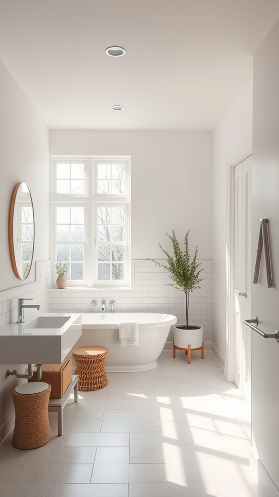 The minimalist design features clean lines and neutral colors, which contribute to a calm atmosphere. A freestanding bathtub sits elegantly, inviting relaxation. The simple yet stylish sink area complements the overall look, while the decorative plants add a touch of nature.