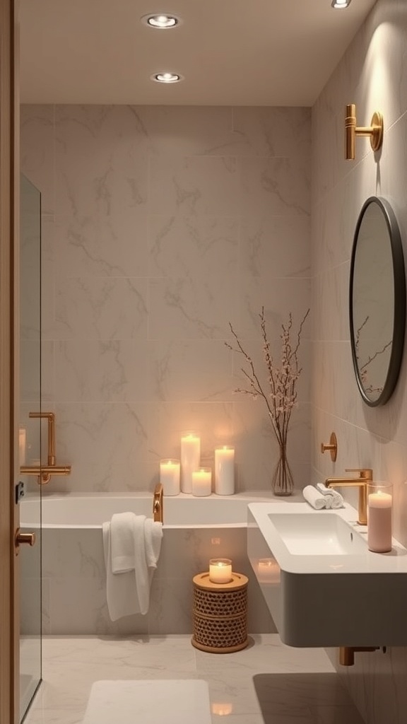 Soft lighting can completely change the feel of your bathroom. In the image, warm candlelight combines beautifully with recessed lights, creating a cozy atmosphere. This mix invites relaxation, making it a perfect spot to unwind after a long day.