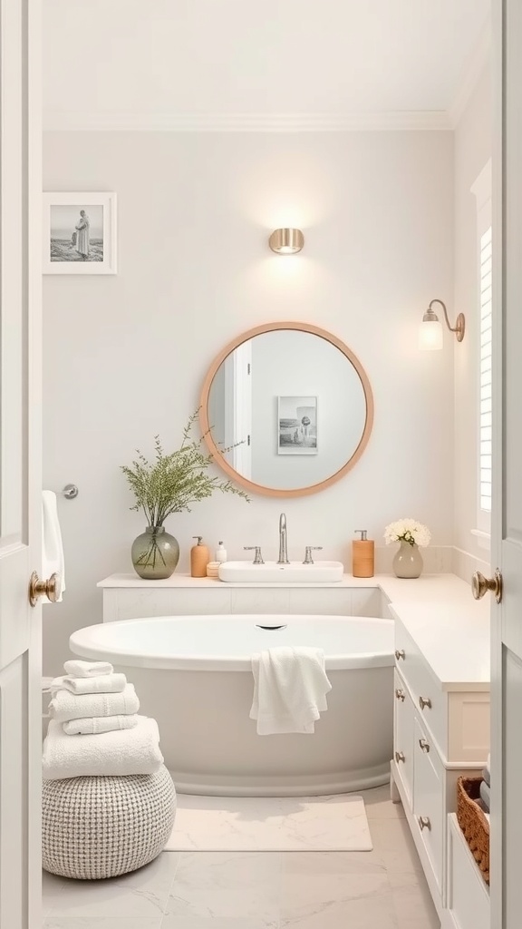 The round mirror with a subtle frame enhances the lightness of the room. It reflects the soft hues, creating a serene atmosphere. The gold fixtures add a touch of luxury without overpowering the gentle color palette.