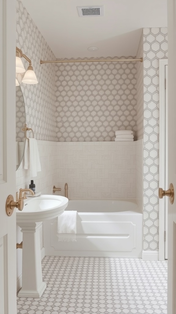 The walls are adorned with a gentle geometric design, offering a touch of sophistication. This pattern complements the smooth lines of the bathtub and sink, creating a harmonious look. The use of light colors helps to keep the space feeling open and airy.