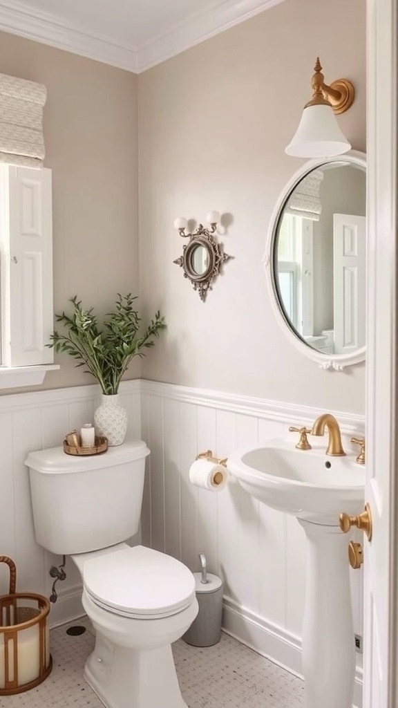 In a neutral bathroom, vintage accents can truly shine. The image showcases a lovely blend of classic elements with a soft color palette. The ornate mirrors add a touch of elegance, reflecting the charm of a bygone era.