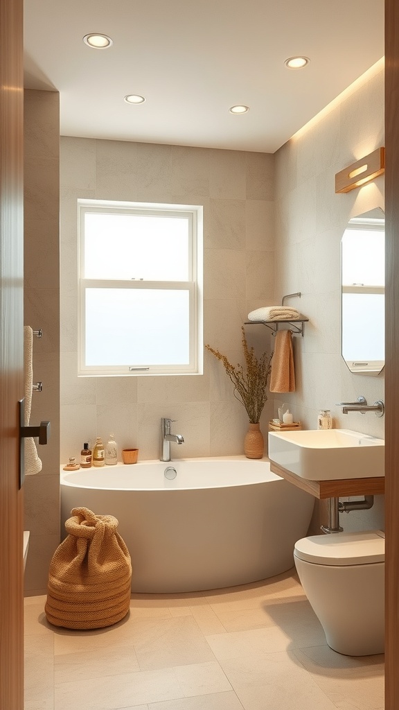 The oval bathtub invites you to unwind after a long day. Its sleek design complements the warm tones, making the bathroom feel spacious and inviting. A simple wooden vanity adds a touch of natural warmth, enhancing the cozy vibe.