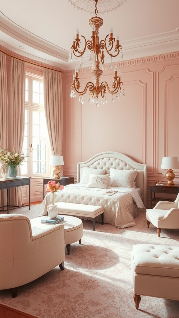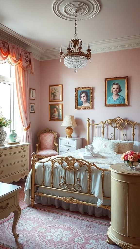 This vintage pastel bedroom is a delightful blend of soft hues and charming decor. The pink walls create a warm and inviting atmosphere, perfect for relaxation. A beautiful chandelier hangs from the ceiling, adding a touch of elegance to the space.