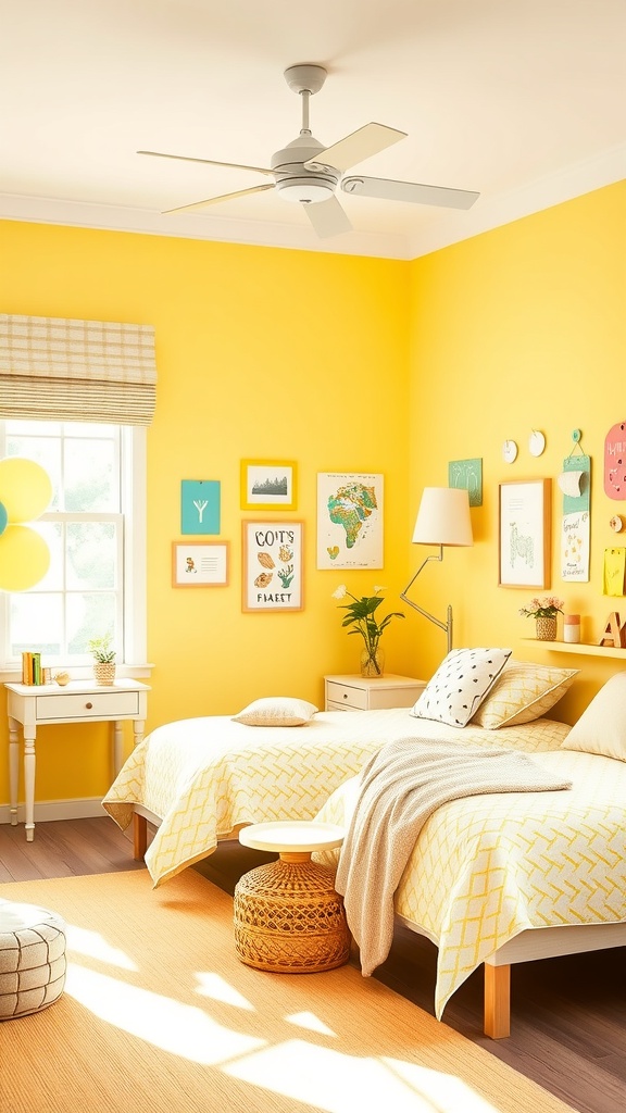 The two beds are dressed in light yellow quilts, adding to the room’s cozy vibe. Each bed has playful pillows that complement the overall theme. A small side table with a unique design sits between the beds, perfect for a nighttime book or a glass of water.