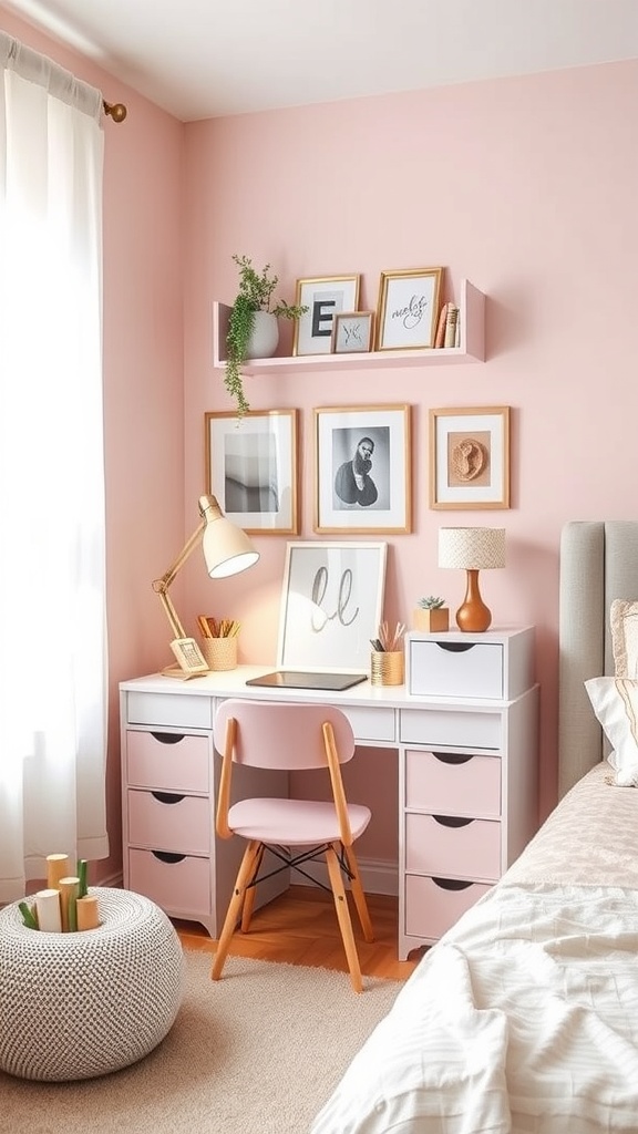 A chic pastel workspace can make a huge difference in your productivity and mood. The image showcases a lovely setup with soft pink walls that create a calming atmosphere. The desk is sleek and modern, featuring a mix of wood and white finishes that add warmth and style.