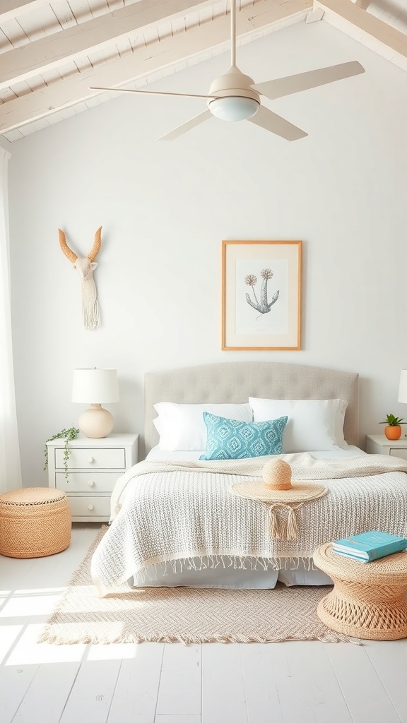 The bed, dressed in a cozy blanket, invites you to snuggle in. A pop of turquoise from the decorative pillow adds a cheerful touch, reminiscent of clear ocean waters. The woven elements, like the baskets and rug, bring in that beachy charm, making the space feel warm and inviting.