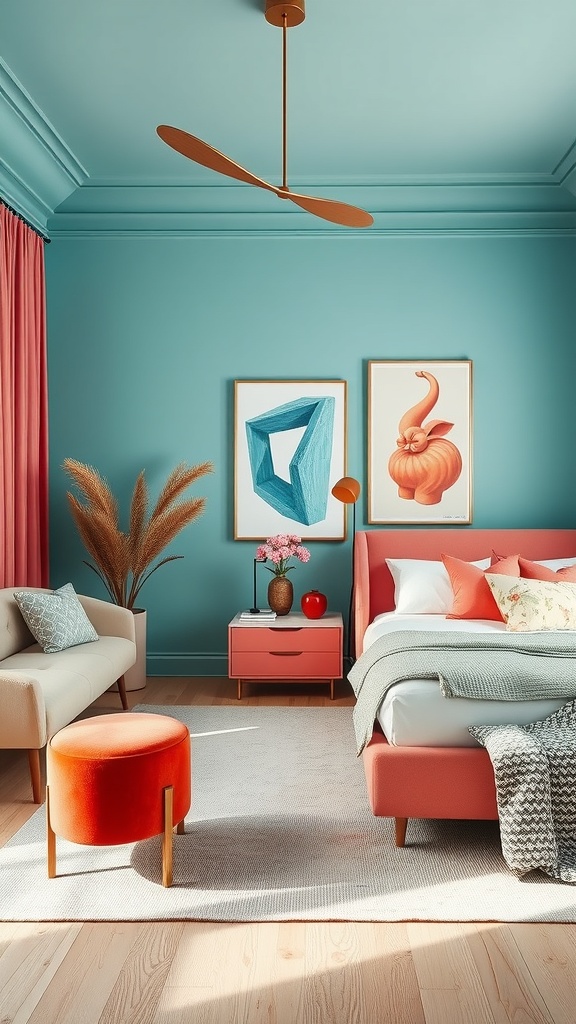 Coral and aqua create a lively and refreshing vibe in any bedroom. This color combination is perfect for those looking to add a splash of fun while maintaining a calm atmosphere. The soft coral hues paired with vibrant aqua tones bring warmth and energy to the space.