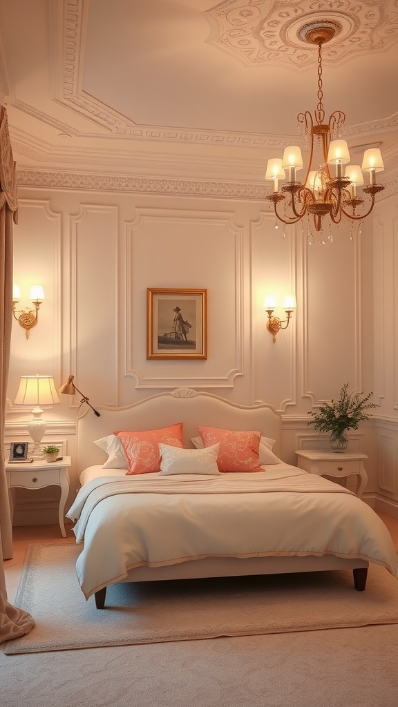 Lighting plays a key role in creating a cozy atmosphere in a pastel bedroom. The soft glow from the chandelier and wall sconces adds warmth to the space. This gentle illumination highlights the delicate pastel tones of the room, making it feel inviting and serene.