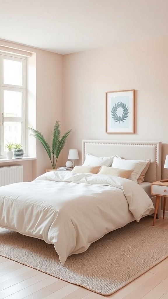 A minimalist pastel bedroom can create a serene and inviting space. The image showcases a clean, bright room with soft pastel accents. The light colors help to make the room feel more spacious and airy.
