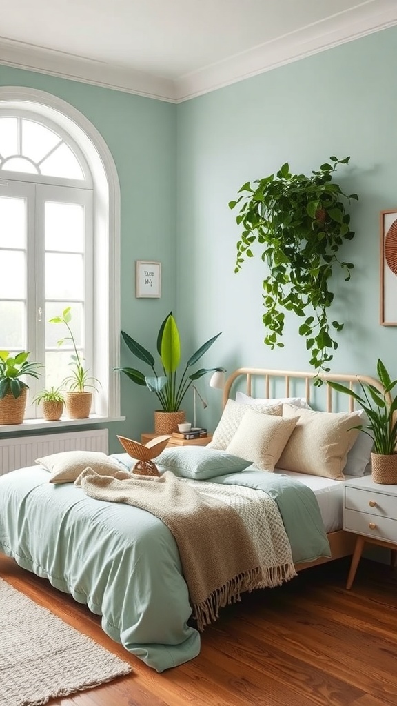 Mint green is a refreshing choice for a bedroom. It brings a calm and soothing vibe that makes the space feel inviting. The soft hue on the walls creates a serene backdrop, perfect for relaxation.