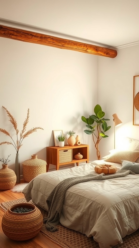 The bedding, in gentle beige, complements the earthy decor. Textures play a big role here, with woven baskets and a chunky knit throw that invite you to snuggle up. Plants bring life to the space, adding a fresh touch that brightens the muted palette.