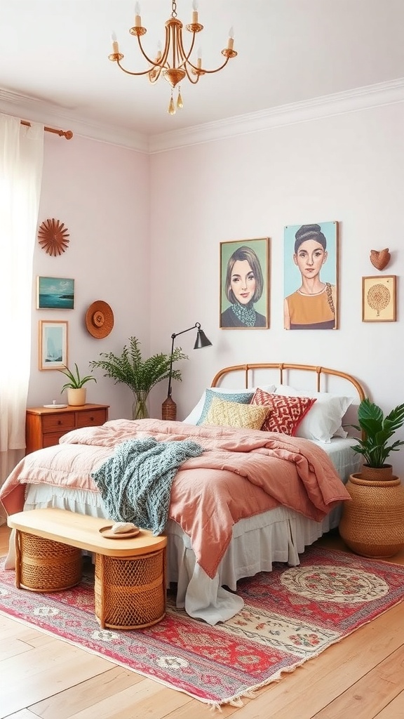 Imagine stepping into a cozy pastel bohemian retreat. The soft pink walls create a warm and inviting atmosphere. This color choice sets a lovely backdrop for the room’s decor.
