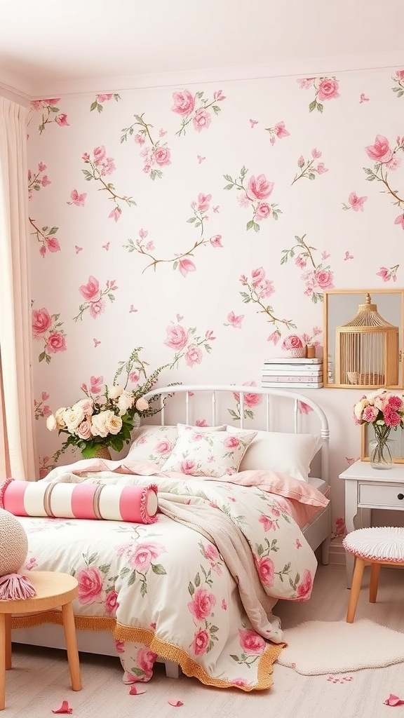 Imagine stepping into a dreamy pastel floral paradise. This bedroom is a perfect blend of soft colors and delicate floral patterns. The walls are adorned with lovely pink roses, creating a warm and inviting atmosphere.