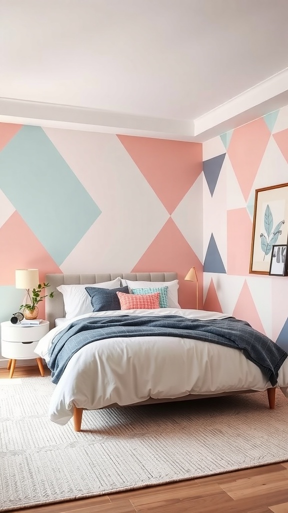 Pastel geometric patterns can bring a fresh and modern vibe to any bedroom. The image showcases a lovely blend of soft pink and white shapes on the wall, creating a playful yet calming atmosphere. This design choice adds a unique touch, making the space feel both stylish and inviting.