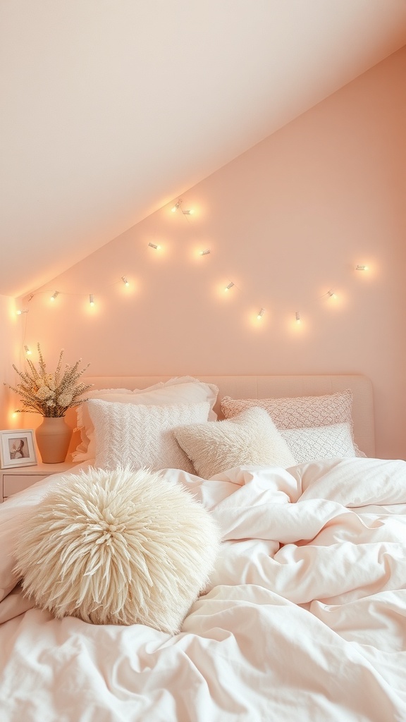 To add a bit of charm, delicate flowers are placed beside the bed. They bring a hint of nature indoors, enhancing the overall feel of the room. String lights twinkle softly on the wall, providing a warm glow that makes the space feel magical, especially in the evenings.