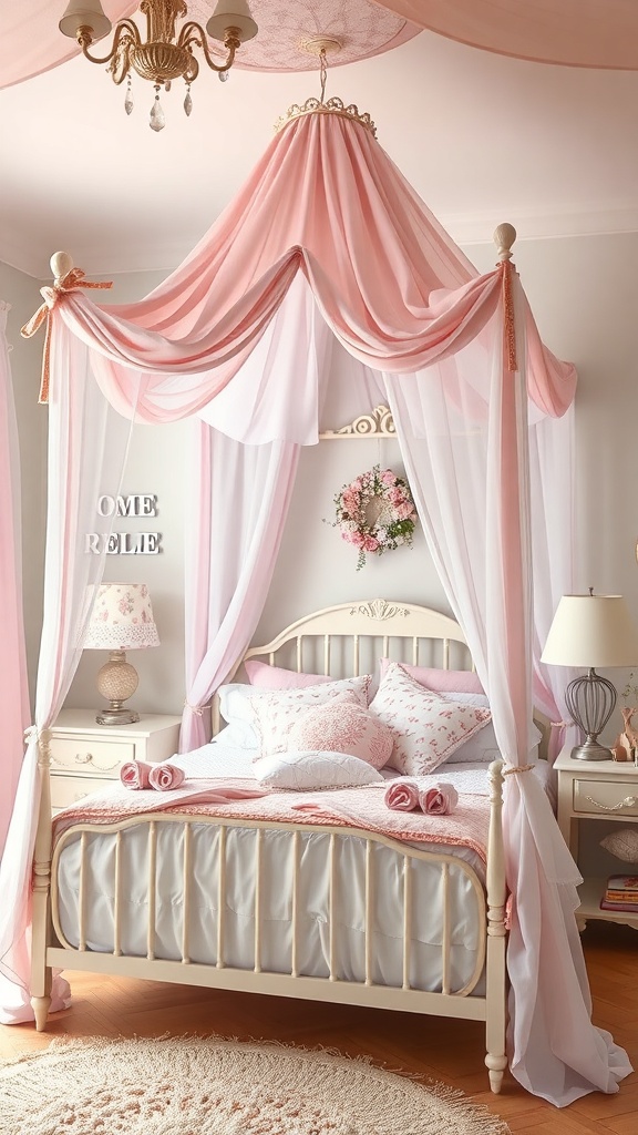 A pastel canopy can transform a bedroom into a dreamy retreat. The soft pink hues create a gentle and inviting atmosphere. This setup features flowing drapes that hang gracefully from the ceiling, adding a touch of elegance.
