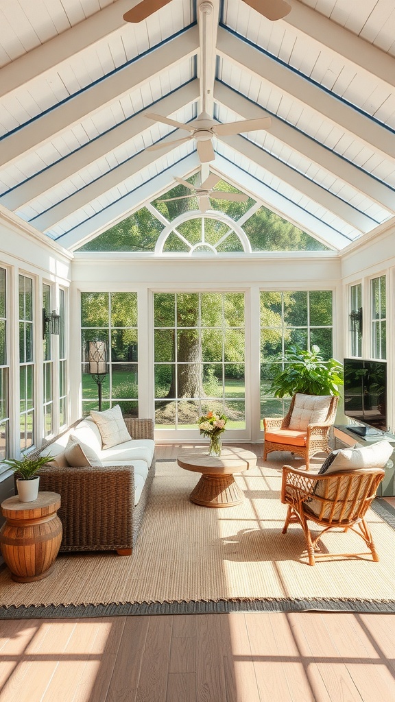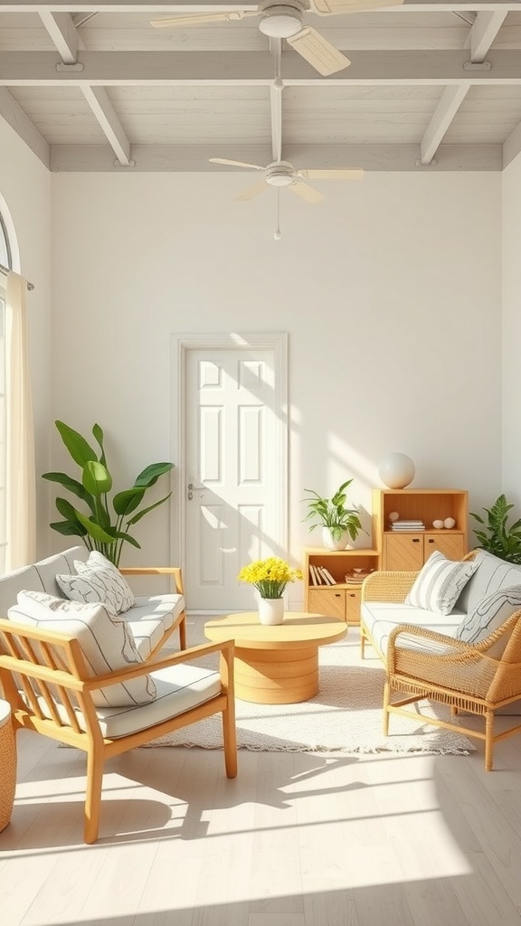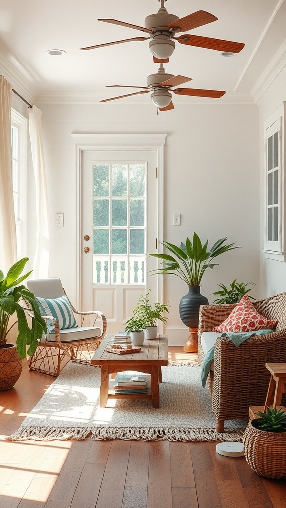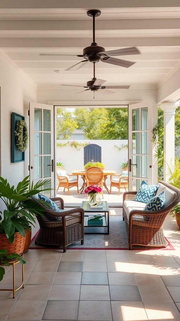 The choice of furniture adds a charming touch. The wicker chairs and wooden tables create a welcoming vibe, encouraging relaxation and conversation. Potted plants bring a splash of life and color, making the room feel fresh and vibrant. Details like the decorative rug and the subtle ceiling fan enhance comfort while maintaining a light atmosphere.