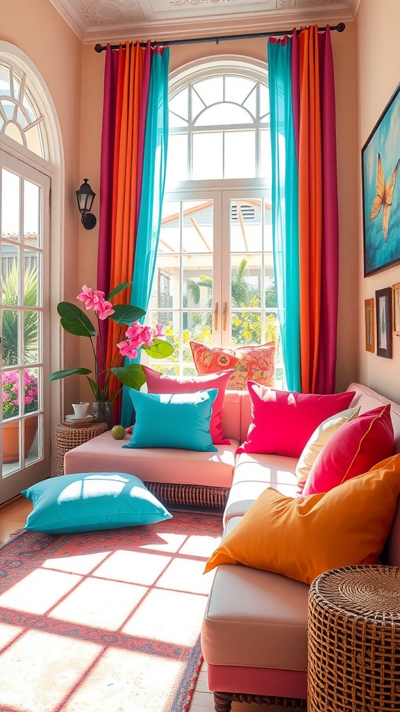 The mix of cushions in shades of pink, yellow, and patterned designs adds to the playful feel. These elements bring not just comfort but also contrast, helping to create a lively environment. The cozy sofa and playful pillows invite relaxation, making it a great spot for unwinding on a summer day.