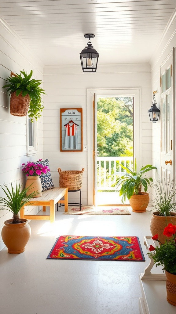 The hanging plants add a touch of greenery, making the space feel alive and connected to nature. A cozy bench paired with a decorative pillow offers a comfortable spot to sit, adding to the friendly atmosphere. The colorful rug adds a splash of personality, creating a focal point that is both inviting and fun.
