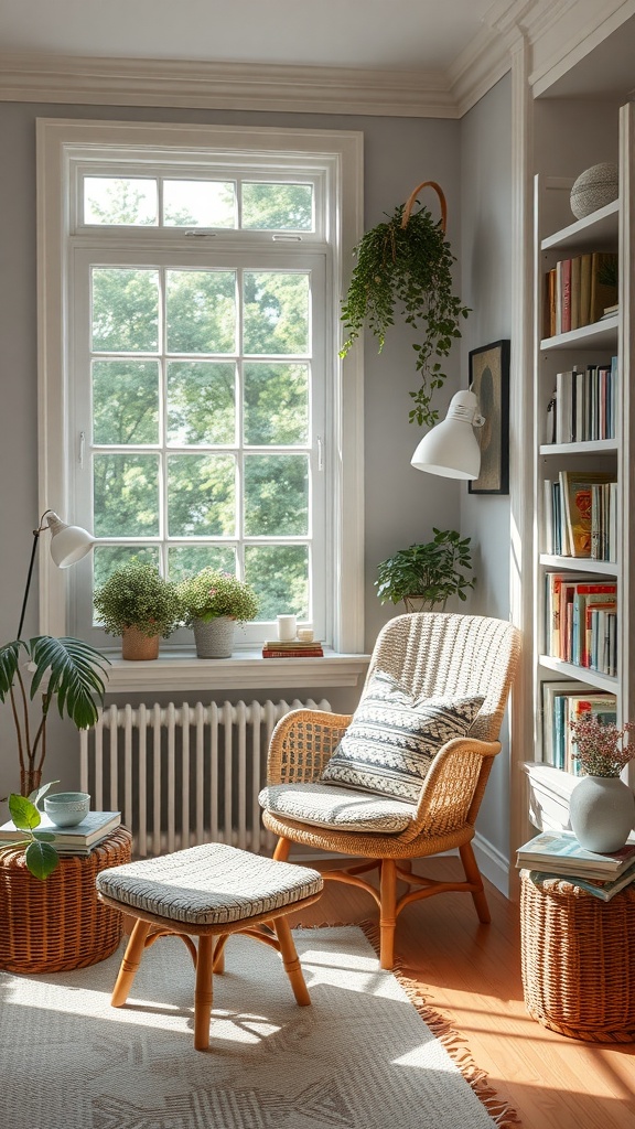 The comfortable chair, with its soft cushions, is a perfect spot to sink into with your favorite novel. The natural materials, like the woven chair and soft rug, create a welcoming atmosphere. A small footrest adds to the comfort, letting you kick back for hours.