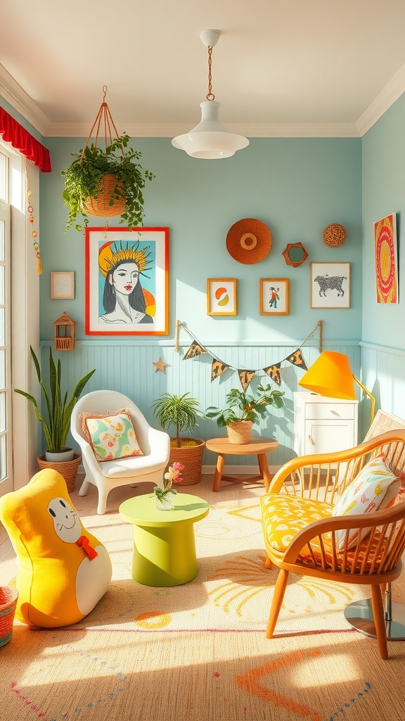 Plants bring life to the room, with hanging greenery adding texture and a pop of freshness. Art pieces on the walls, including bold portraits and fun patterns, spark creativity. This playful space encourages you to relax, unwind, and enjoy the simple pleasures of summer living.
