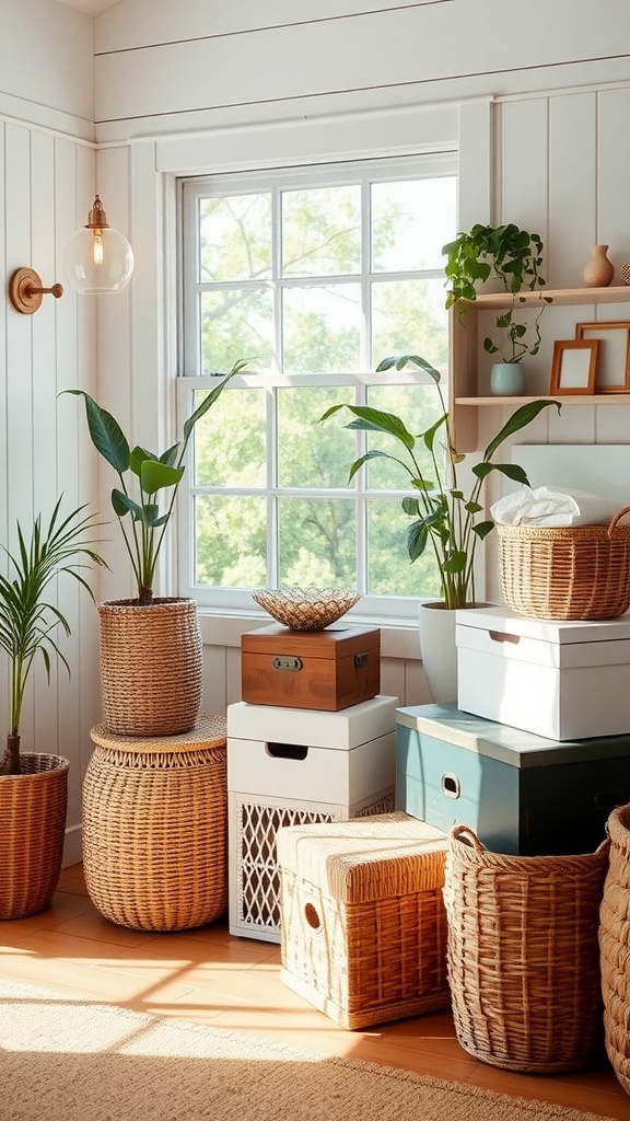 Summer rooms bring a bright, airy feel and need storage that fits this vibe. The image shows a cozy corner filled with various storage baskets and boxes. Each piece is not only functional but also adds charm to the space.