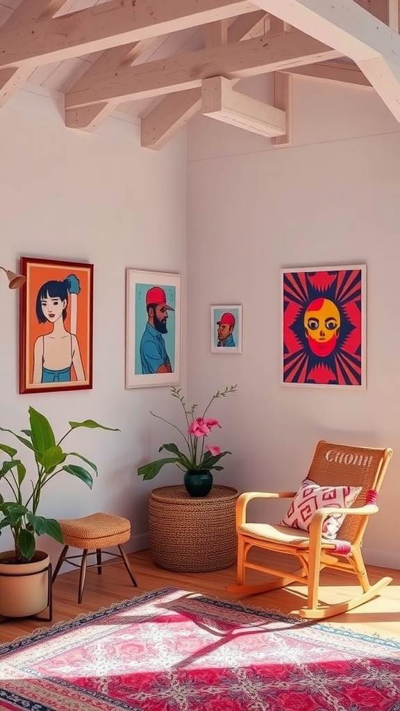 Don’t forget the cozy seating! The rocking chair invites you to sit back and soak in your surroundings. Complimenting the art with comfy furniture is key to creating a space that feels both stylish and inviting.