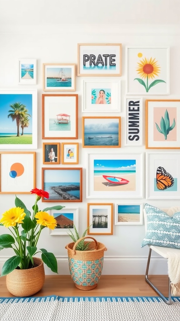 Incorporating different frame styles adds character. The wooden frames complement the natural elements in the room, such as the lush plants below. This combination not only enhances the overall summer aesthetic but also brings a touch of nature indoors.