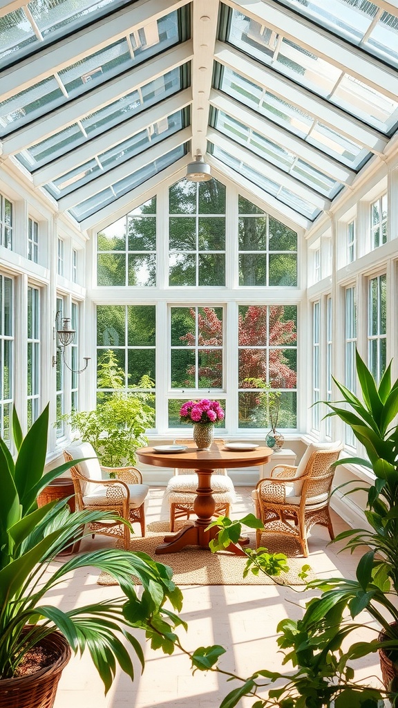 With the right arrangement of furniture, like the cozy chairs and simple table, you can enjoy the warmth while reading a book or sipping your favorite drink. The plants also thrive with this abundant light, making the space feel alive.