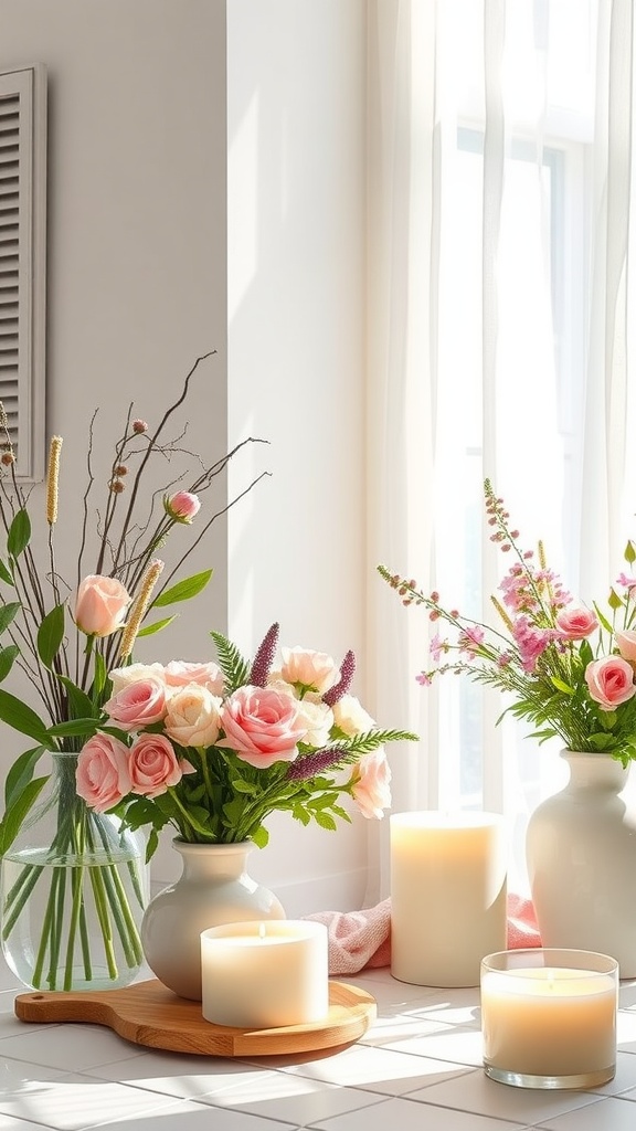 Fresh flowers like roses and delicate greenery not only brighten the space visually but also fill the air with their natural fragrance. Consider arranging flowers in simple vases to keep it casual yet elegant. The light and airy curtains allow natural light to stream in, enhancing the refreshing feel of summer.