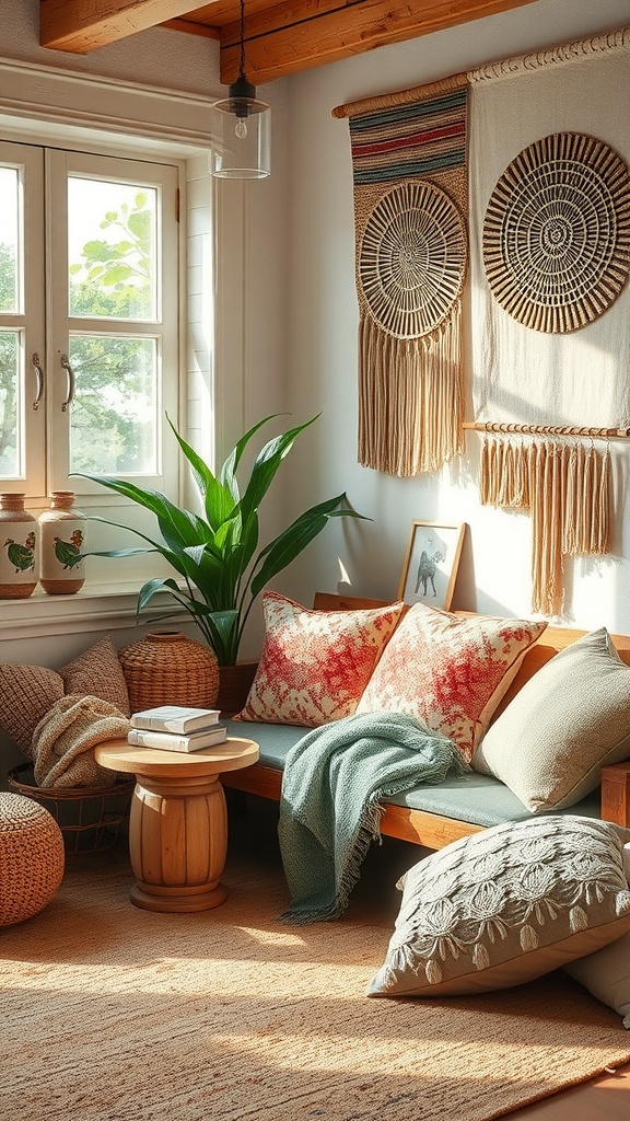 The woven wall hangings add an artistic touch. Their natural fiber complements the wooden furniture, making the room feel inviting. Incorporating these elements creates a visual interest that enhances the overall vibe.