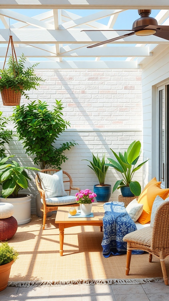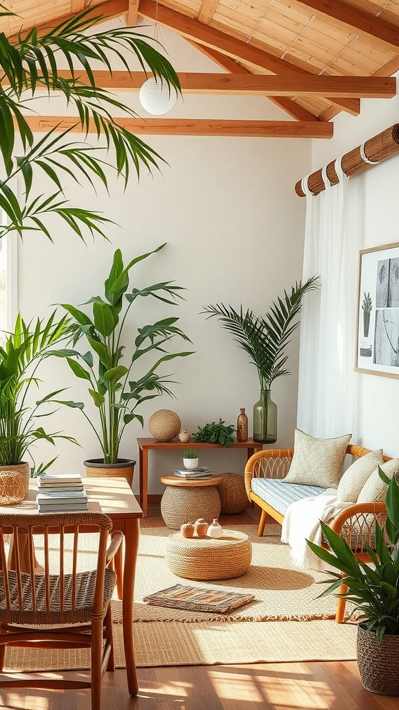 When we think of summer, bright colors and fresh designs come to mind. The image captures a cozy space filled with natural elements that perfectly reflect an outdoor vibe.