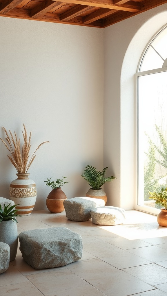Look at the unique shapes of the stone stools scattered around. They invite you to sit back and relax. The soft lines and natural feel of the materials make the space feel inviting. Paired with lush green plants, the room embodies the essence of summer freshness.
