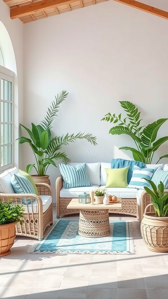 The furniture is a mix of rattan and soft cushions, which adds a warm touch. The bright green and blue accents really pop against the neutral backdrop, creating a lively atmosphere. The striped pillows and the turquoise rug are playful elements that enhance the overall summer feel.