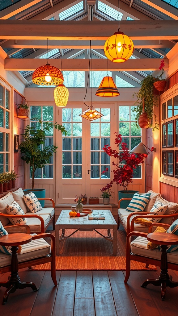 Bright lighting fixtures can completely change the feel of a room, especially in a summer-themed space. In this vibrant setting, colorful pendant lights hang from the ceiling, casting playful shadows and illuminating the room in a cheerful way.