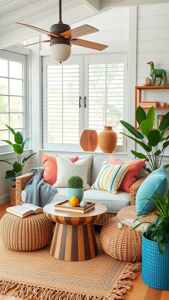 By incorporating a simple layout, this room can easily transition from a peaceful reading nook to a lively gathering spot. A fan spins gently overhead, ensuring comfort during hot summer days. This multi-function space is all about blending comfort and functionality.