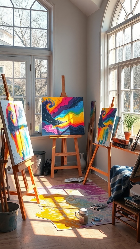 The colorful artworks seem to swirl with stories, each brushstroke alive with passion. The cozy rug adds a splash of color to the wooden floor, creating a warm atmosphere that encourages artistic expression. You can easily picture yourself here, sipping a warm drink while getting lost in a world of creativity.